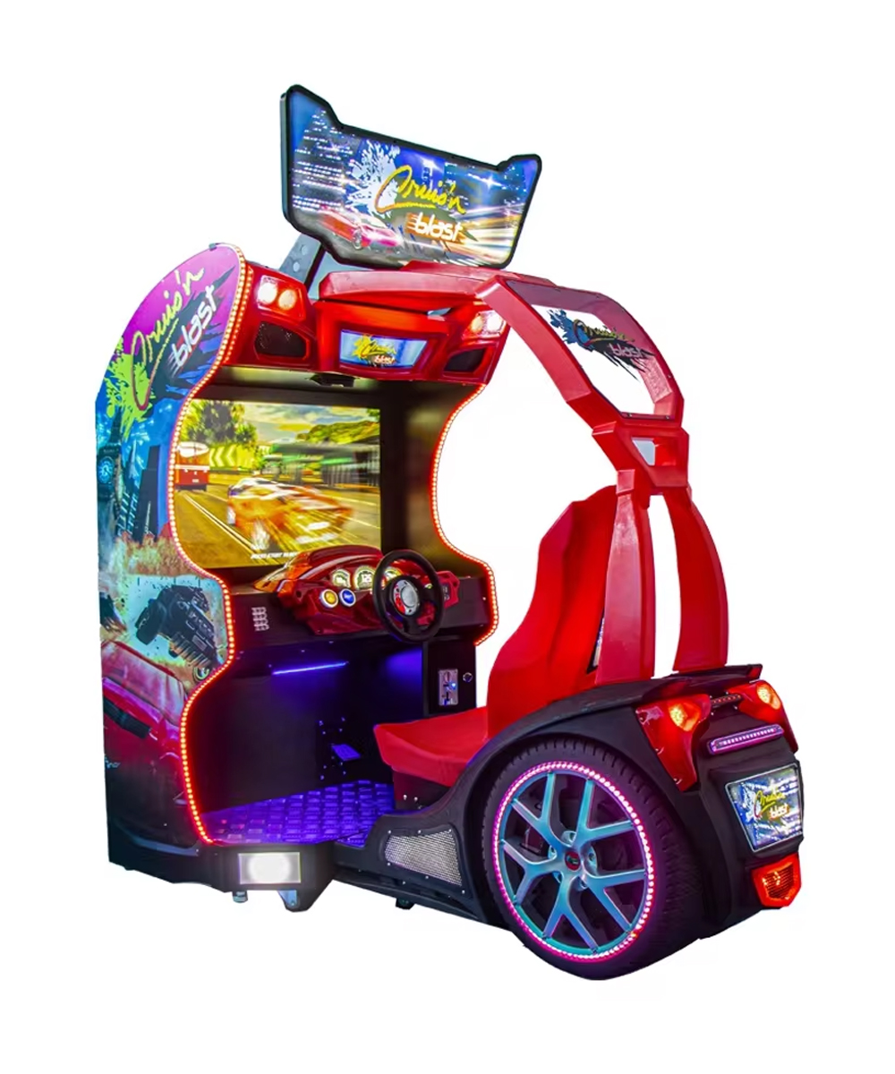 מכונת משחק סימולטור מכוניות יפייפיה הכולל מסך ענק לתצוגה.